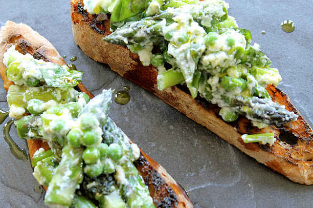 BRUSHETTA WITH FRESH PEAS, ASPARAGUS TIPS AND MINTED CHEESE
